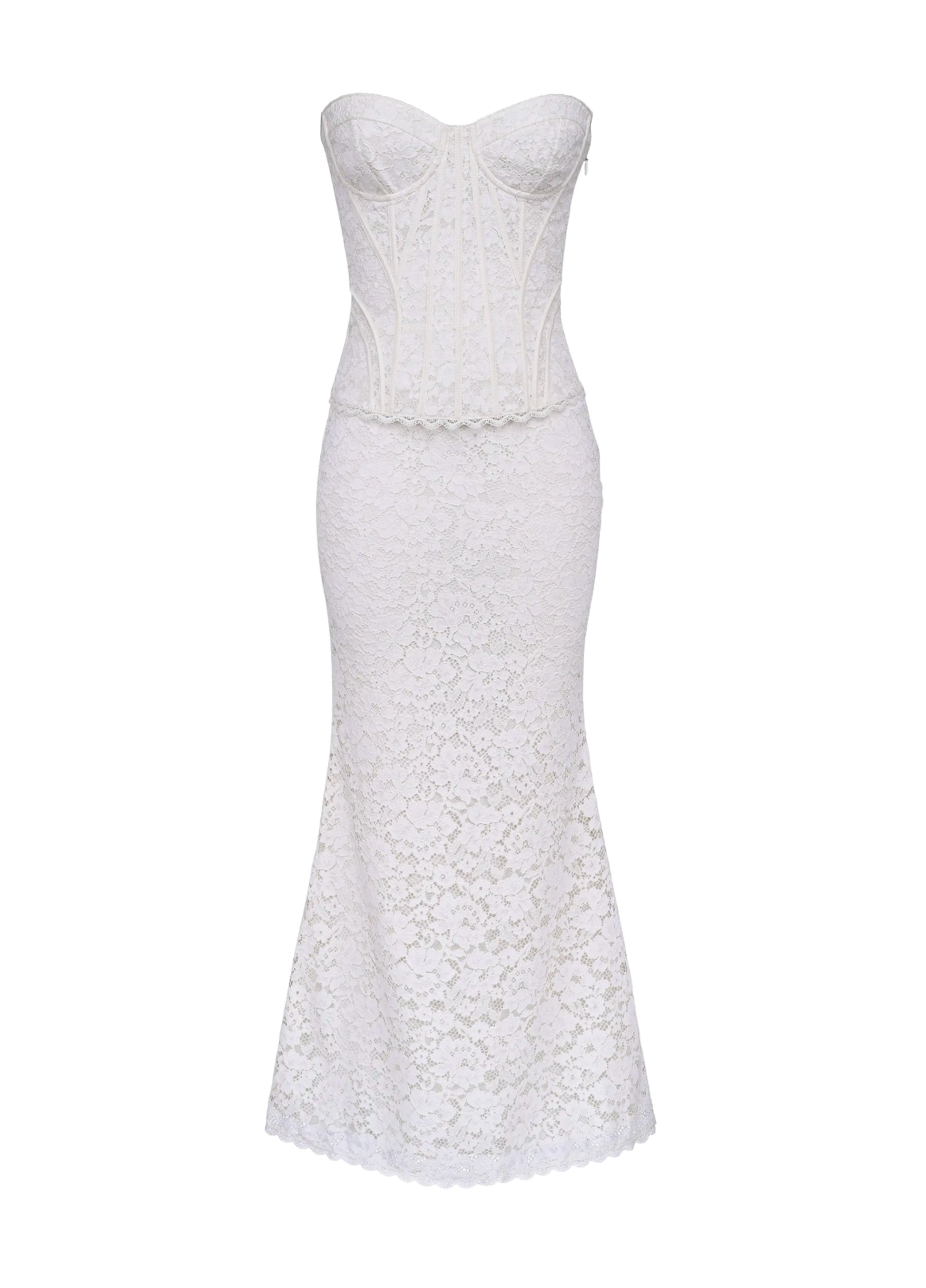 Alessia embodies effortless sophistication through intricate corded lace and sculpted design. The boned corset defines, while the underwired bust provides support. A lace-up back cinches the waist, creating a contoured fit that flows into a graceful floor-length skirt finished with scalloped lace trims.