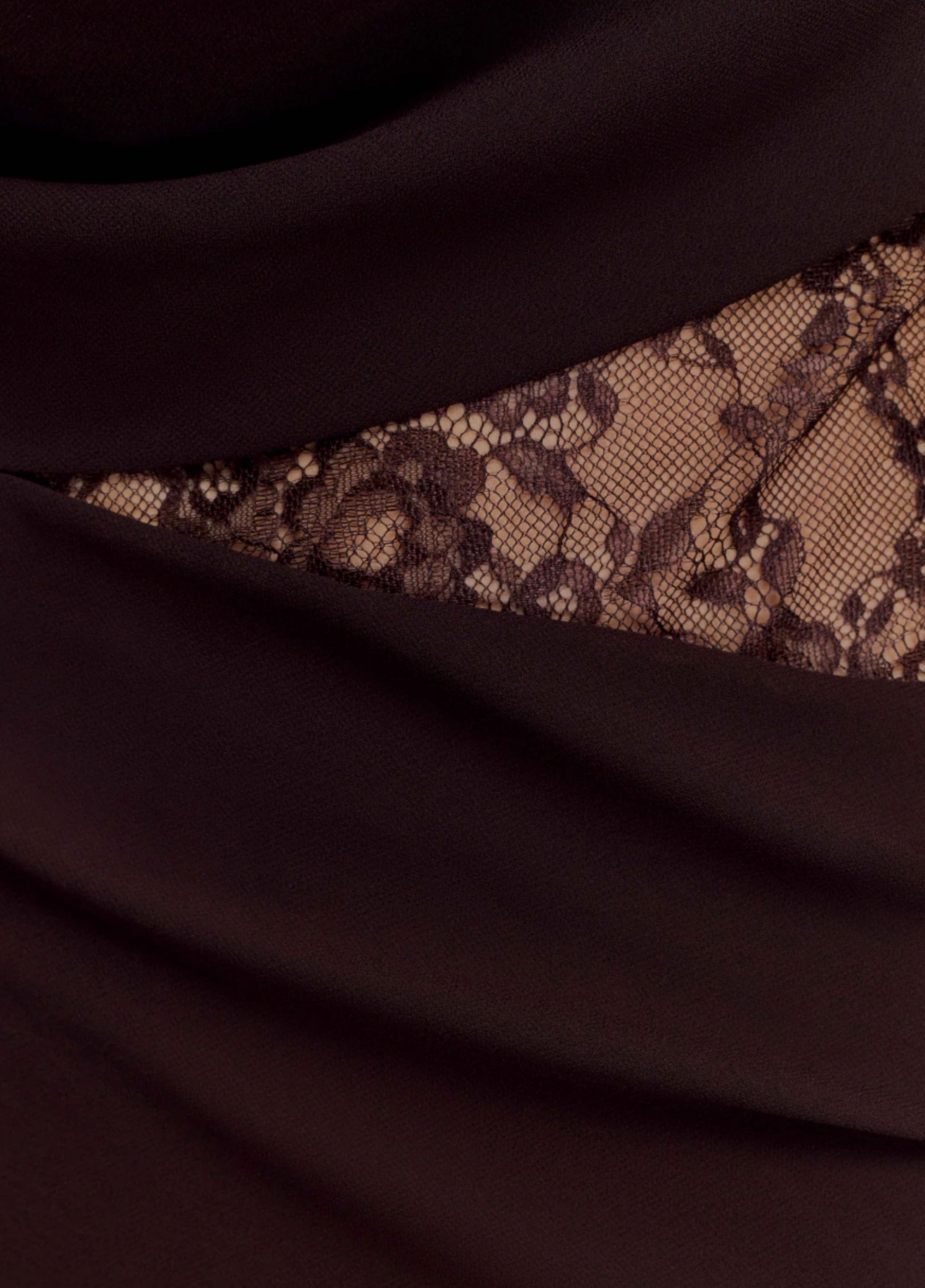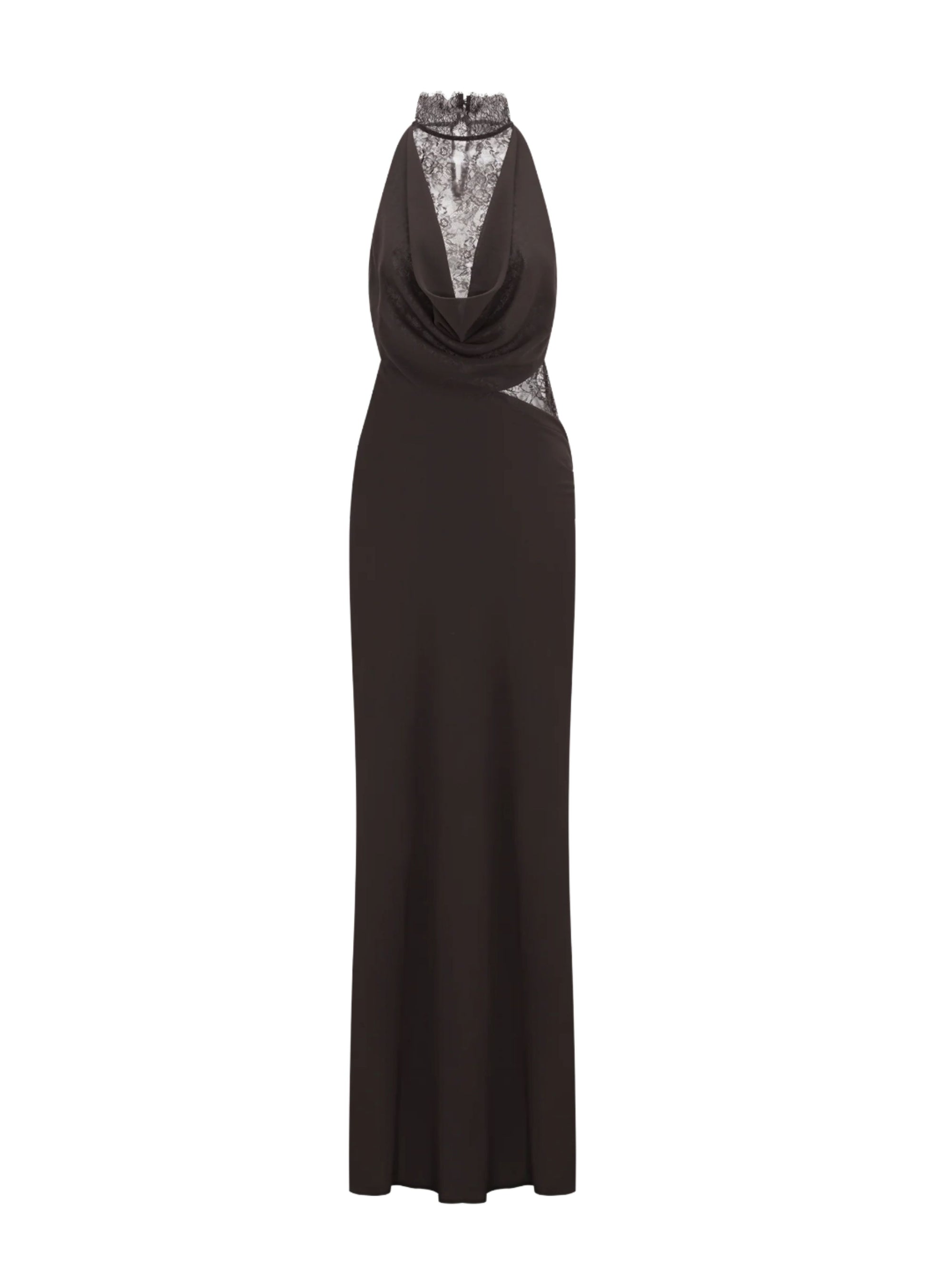 Elowen combines chiffon with intricate lace detailing for refined look. The high neckline is finished with an eyelash lace collar, while the draped cowl front adds gentle allure. At the waist and back, delicate lace inserts create contrast. Fully lined for comfort, this maxi-length silhouette flows gracefully.