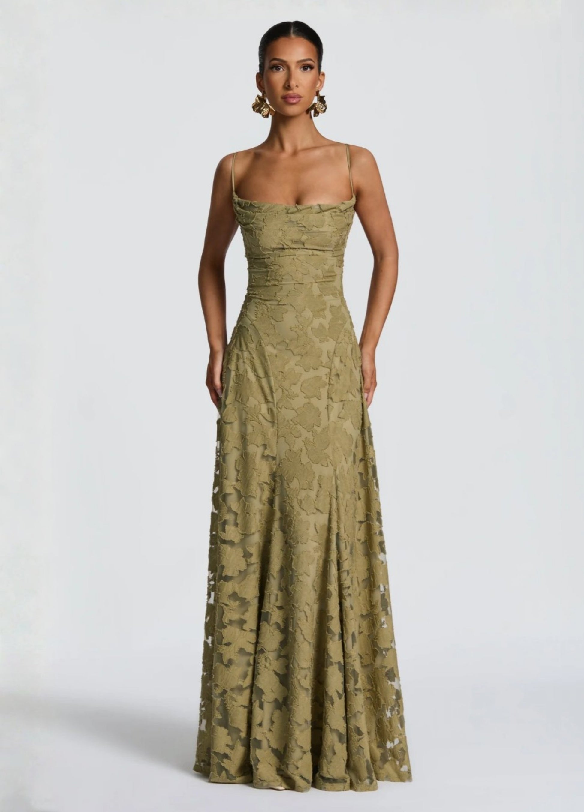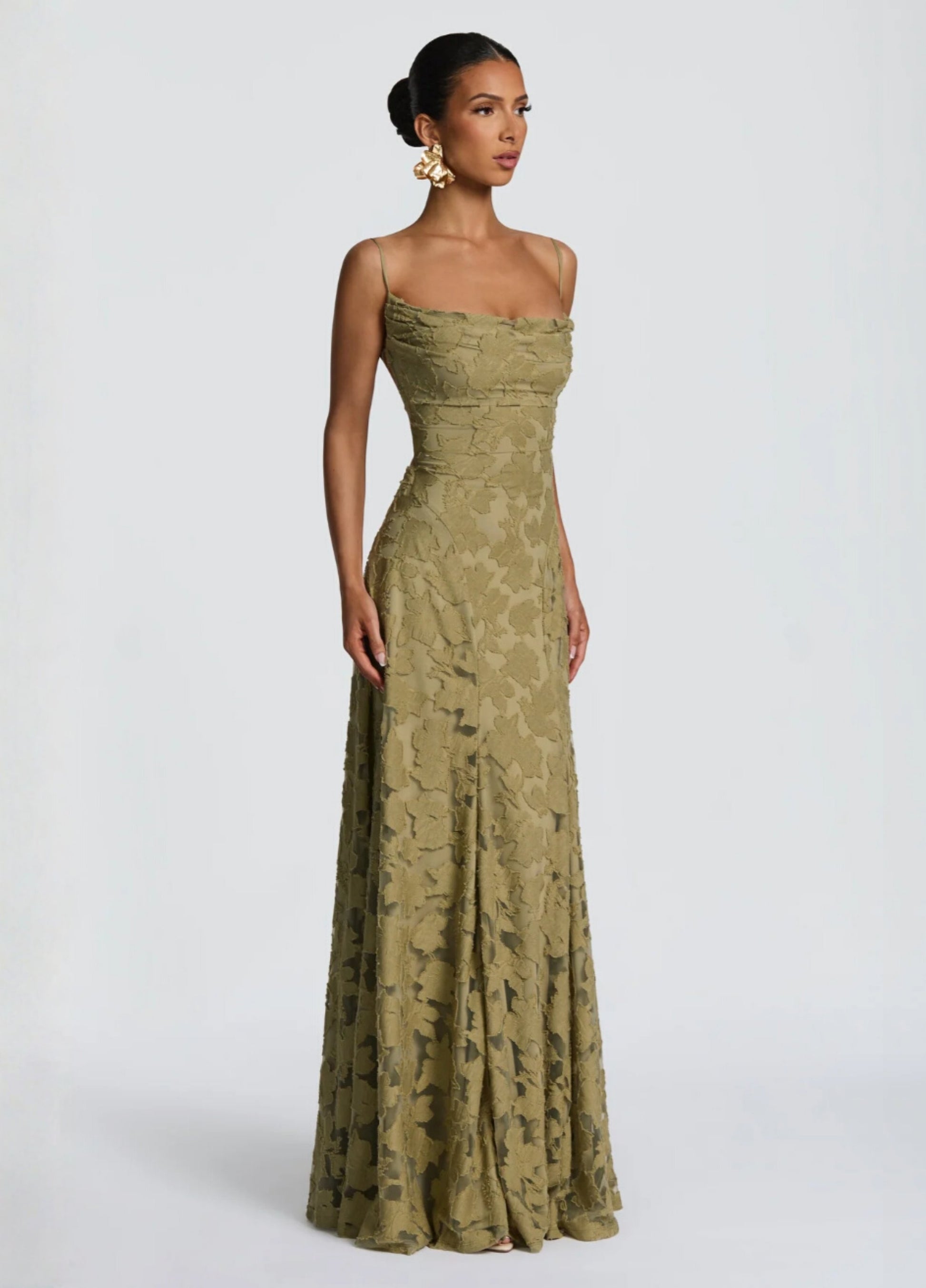 Lucia features an elegant draped cowl neckline and flowing silhouette, crafted from a floral fabric that catches the light with every step. The open lace-up back adds a touch of modern romance, while the full skirt with godet panels creates an effortlessly refined look.