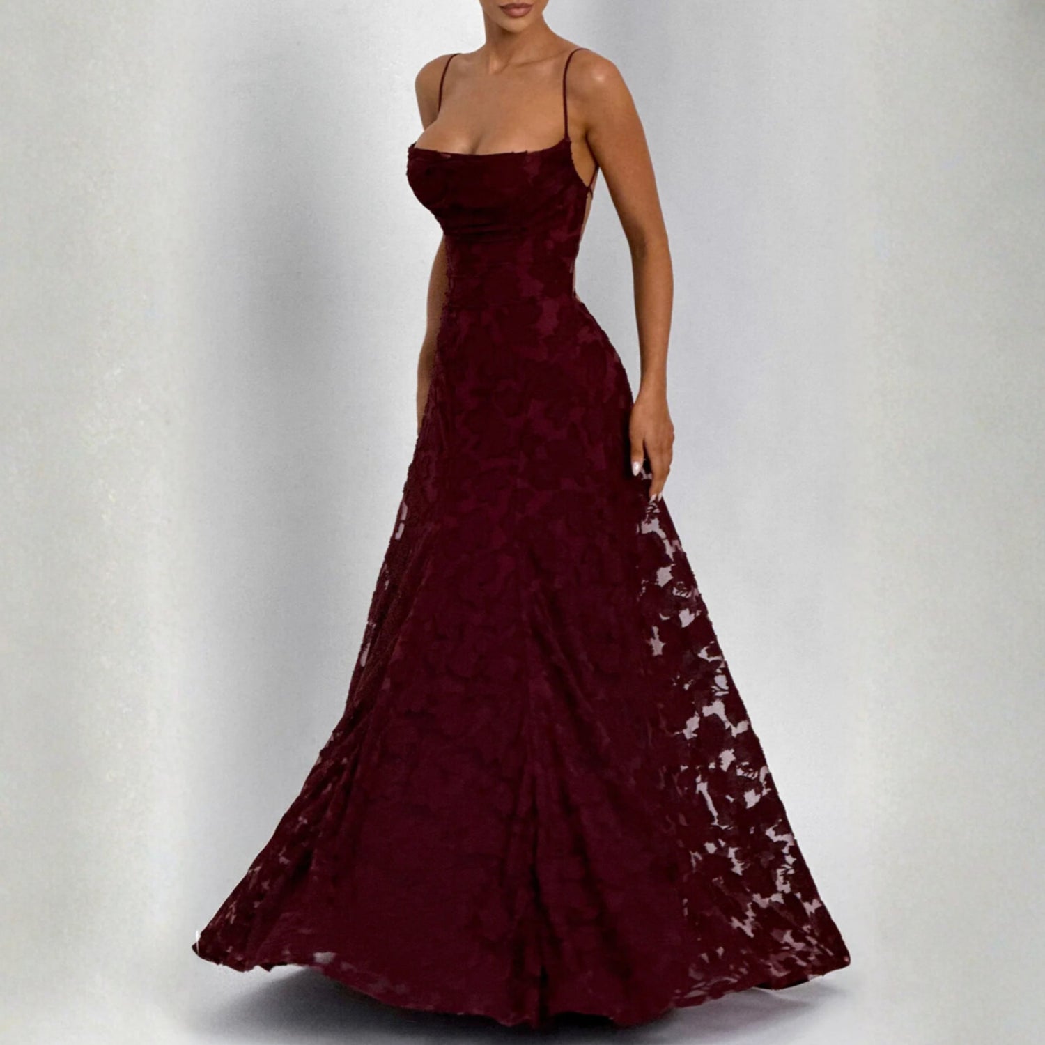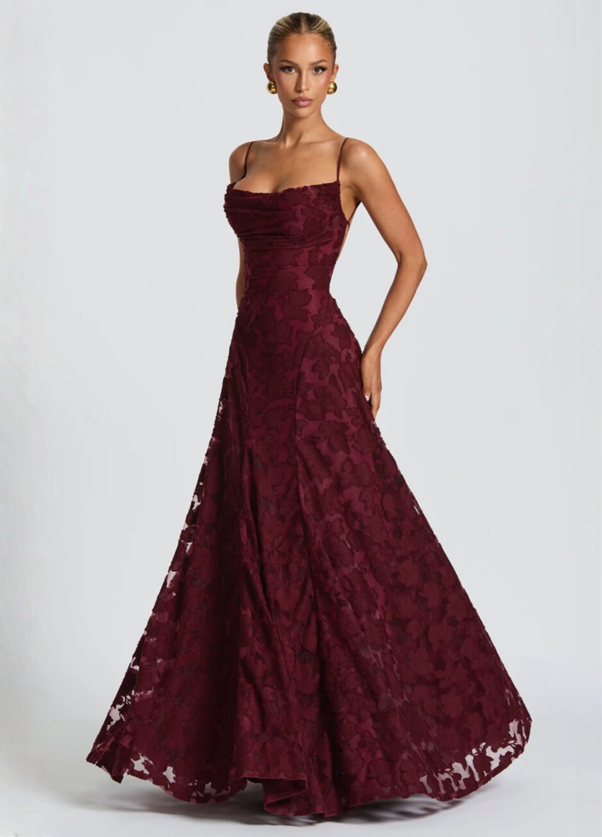 Lucia features an elegant draped cowl neckline and flowing silhouette, crafted from a floral fabric that catches the light with every step. The open lace-up back adds a touch of modern romance, while the full skirt with godet panels creates an effortlessly refined look.