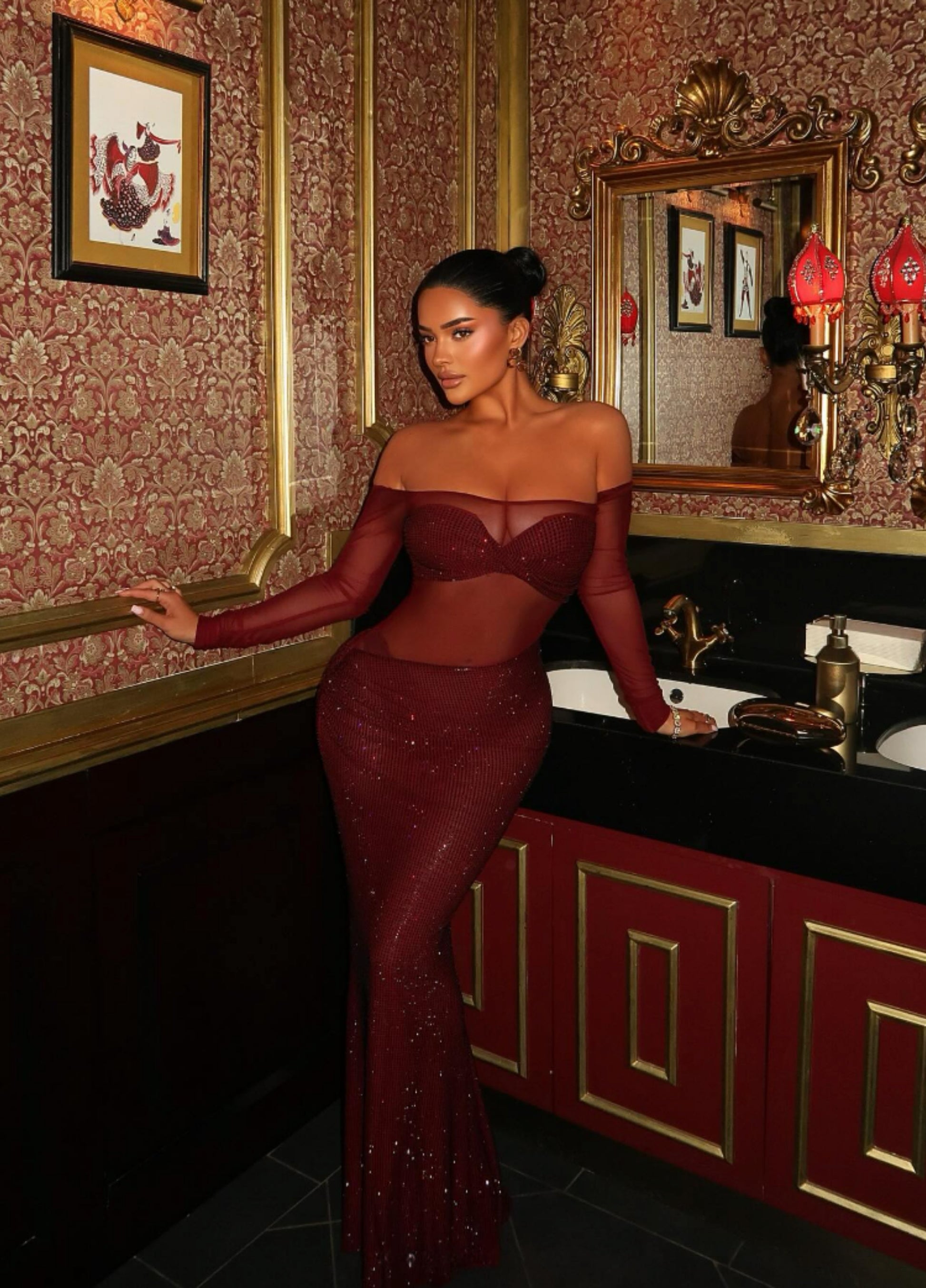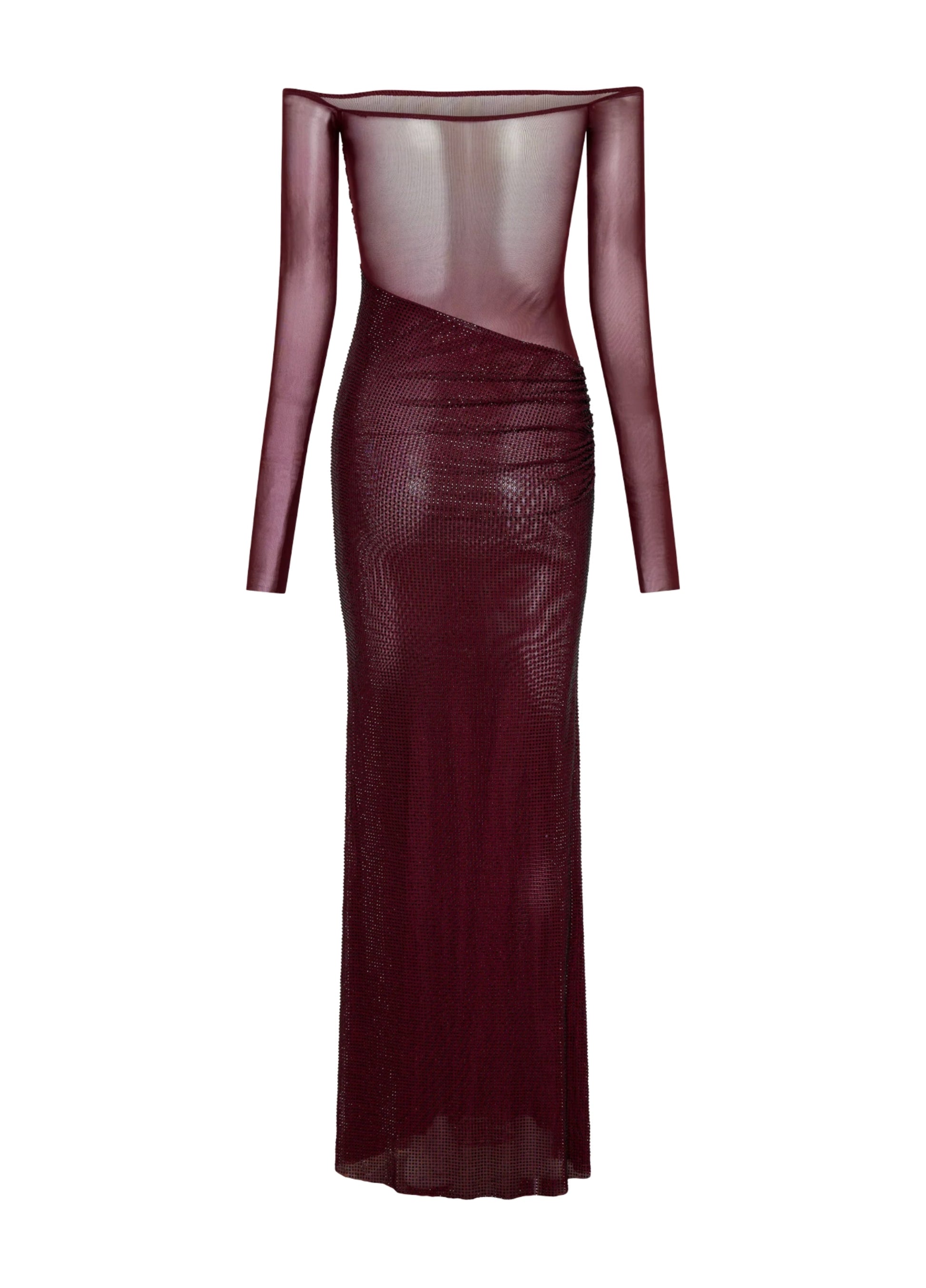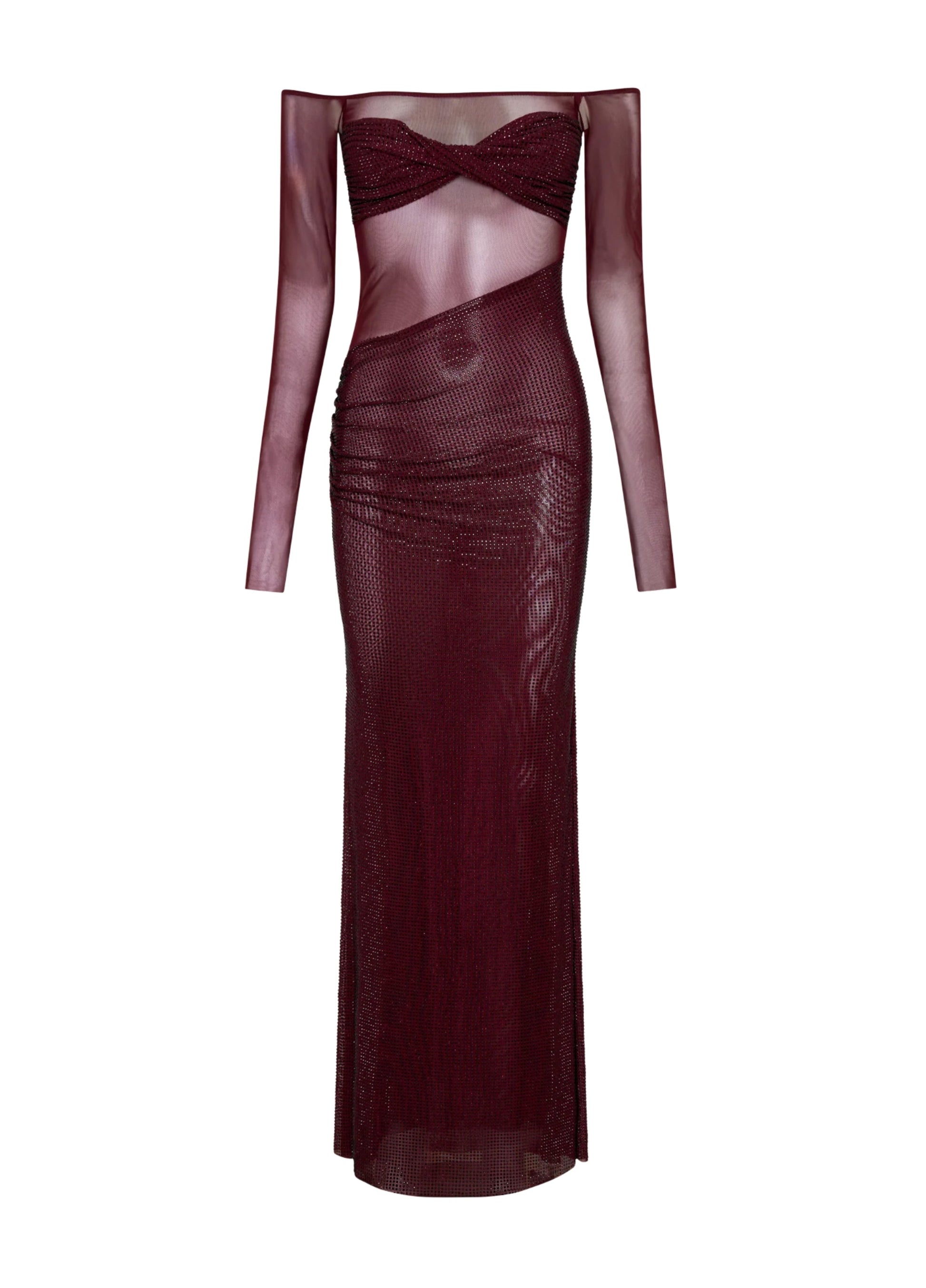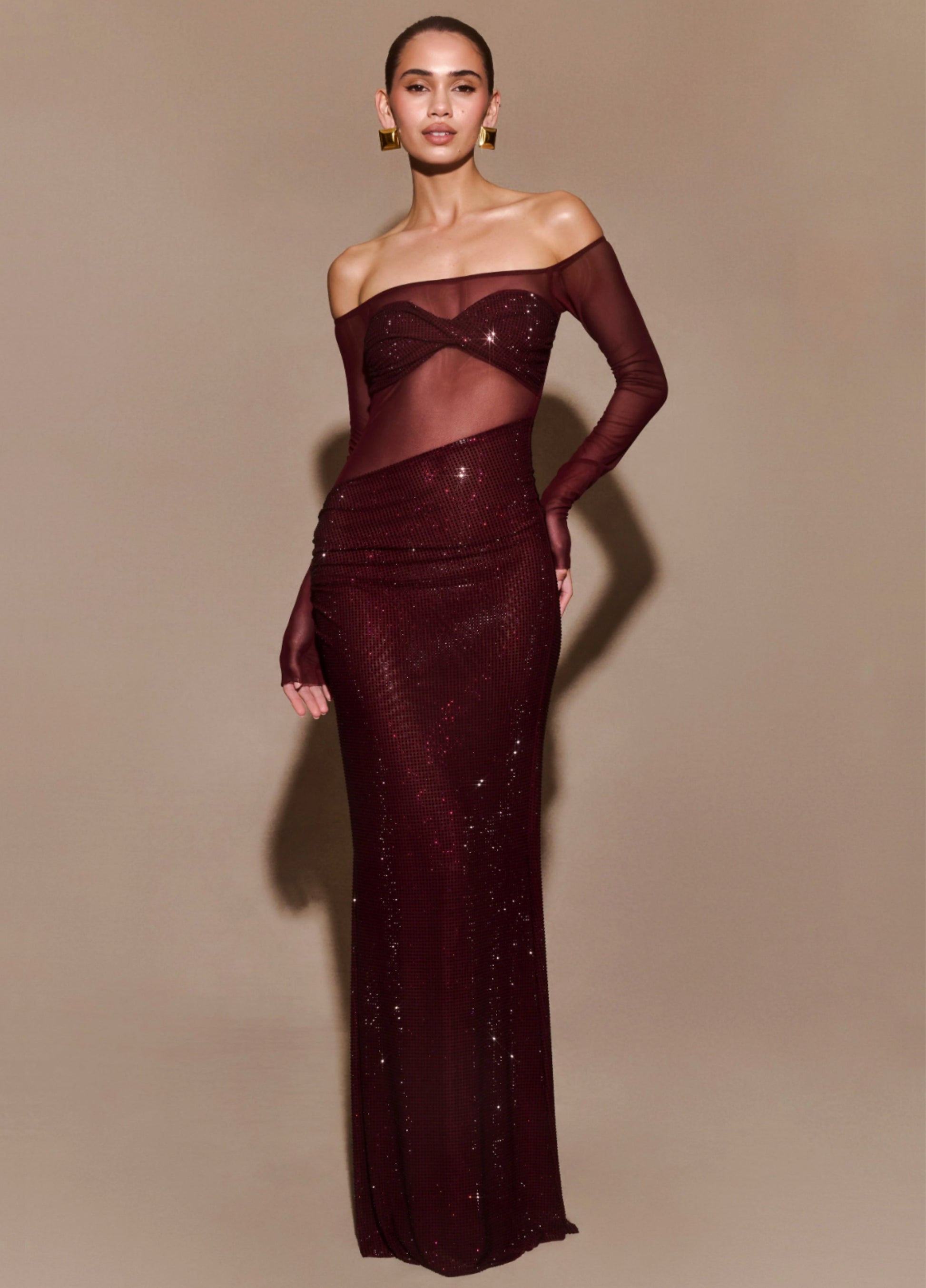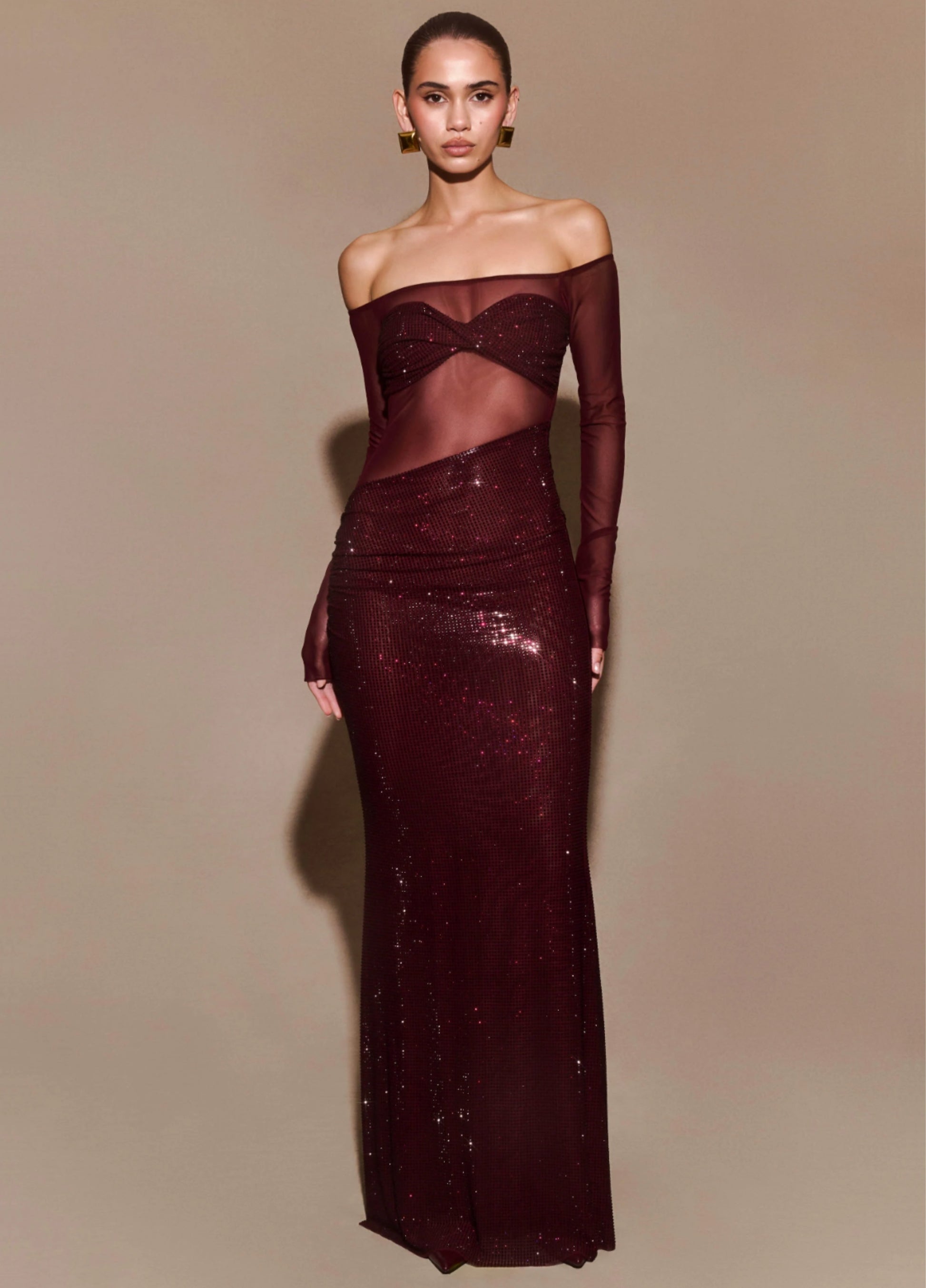 Crafted from stretch mesh, Maeve drapes the body with elegance. The Bardot neckline, long sleeves and contrast embellished bust create a timeless silhouette. A twist-front detail flows into an asymmetric waistline, with gentle gathering. It's finished with a shimmering embellished skirt.