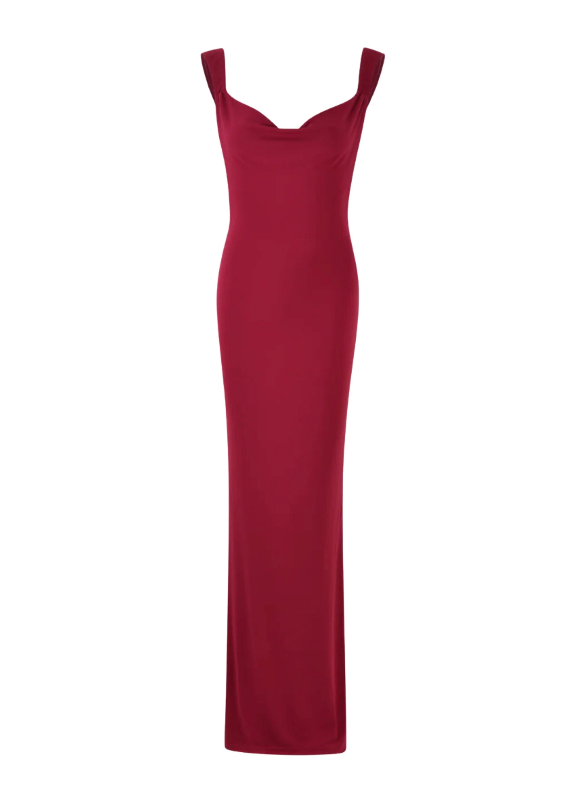 Marina features a body-skimming silhouette paired with a cowl neckline, crafted from a soft stretch fabric that hugs every curve. The open low-cut back delivers a striking reveal, finished with a minimal slip-on construction.