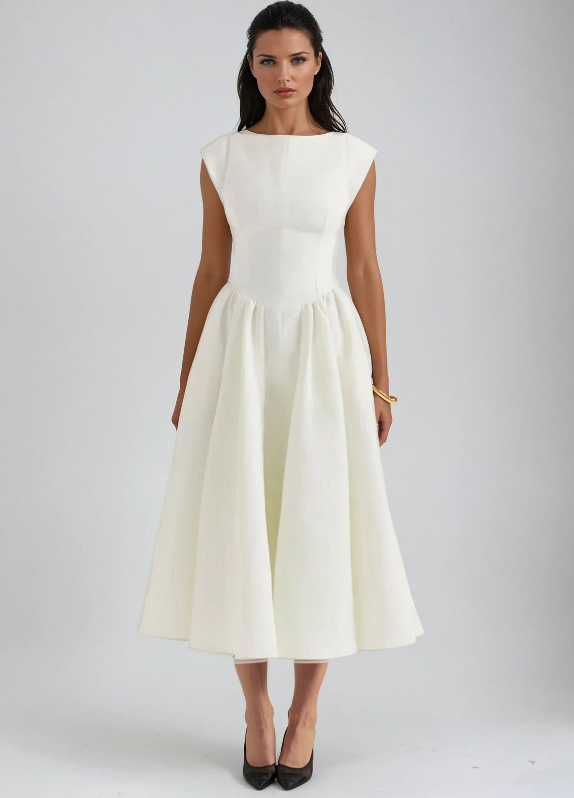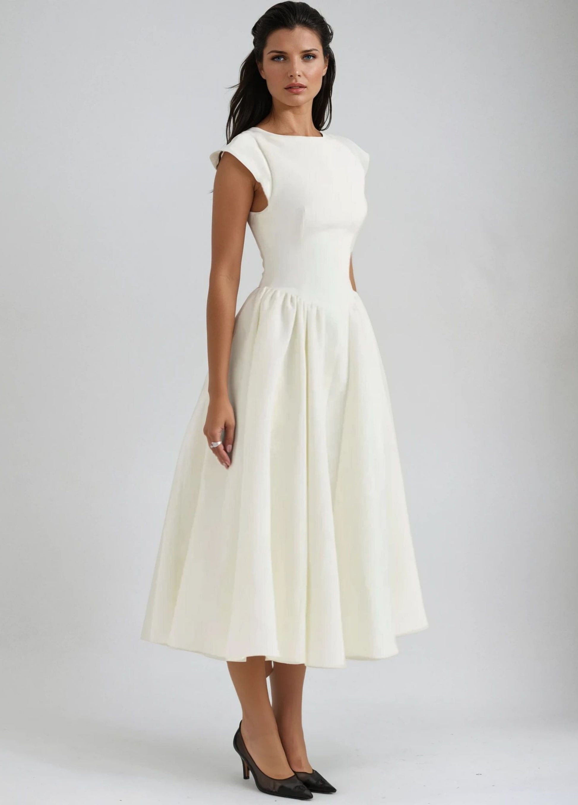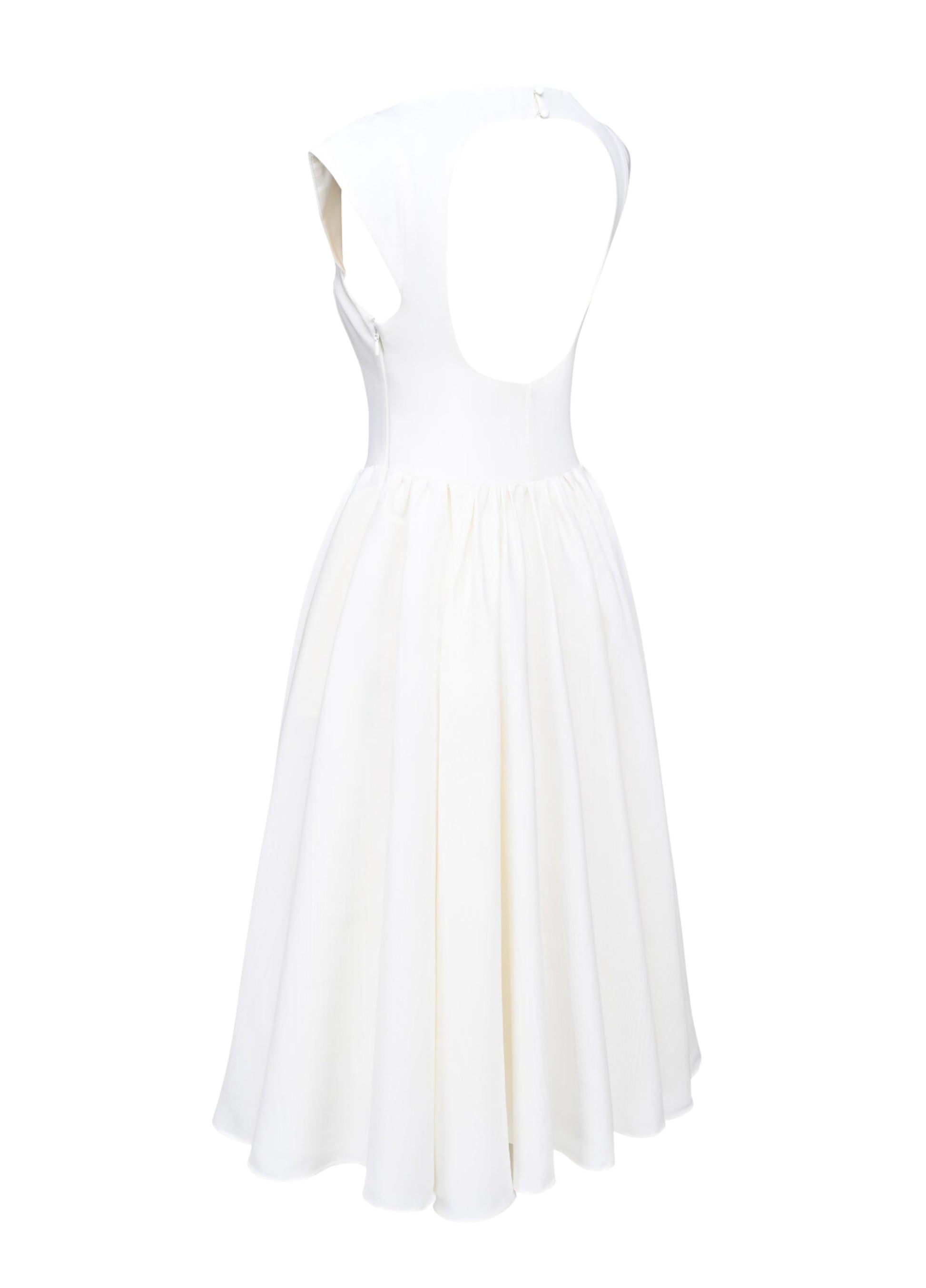 Odette embodies sophistication, crafted from a fluid, beautifully draped fabric that flows effortlessly. Designed for occasions that call for grace and confidence, it features a full-skirted silhouette, elegant dropped shoulder, and open-back design for a refined impression. The dress fastens with a concealed side zipper for a smooth, seamless finish.