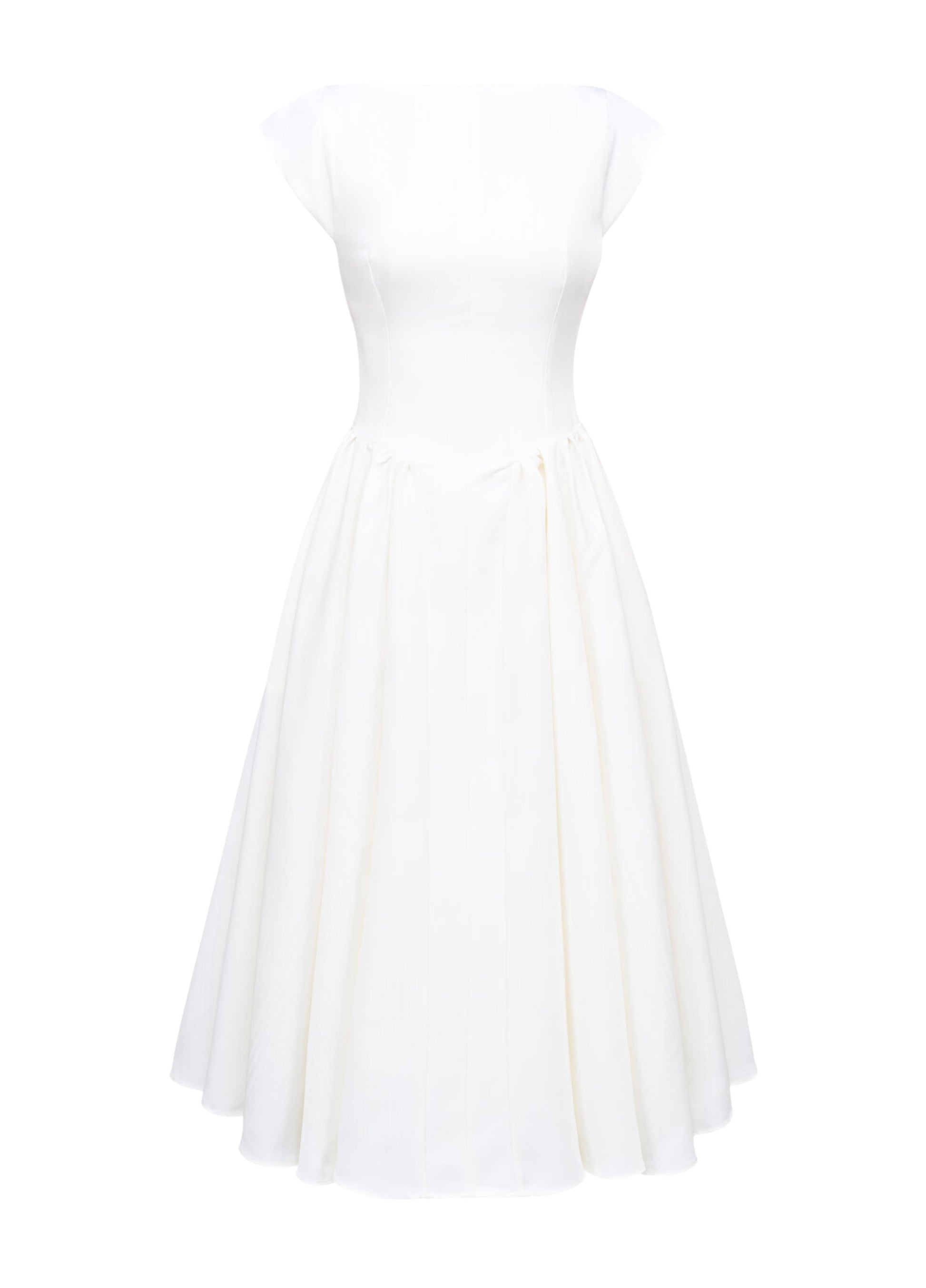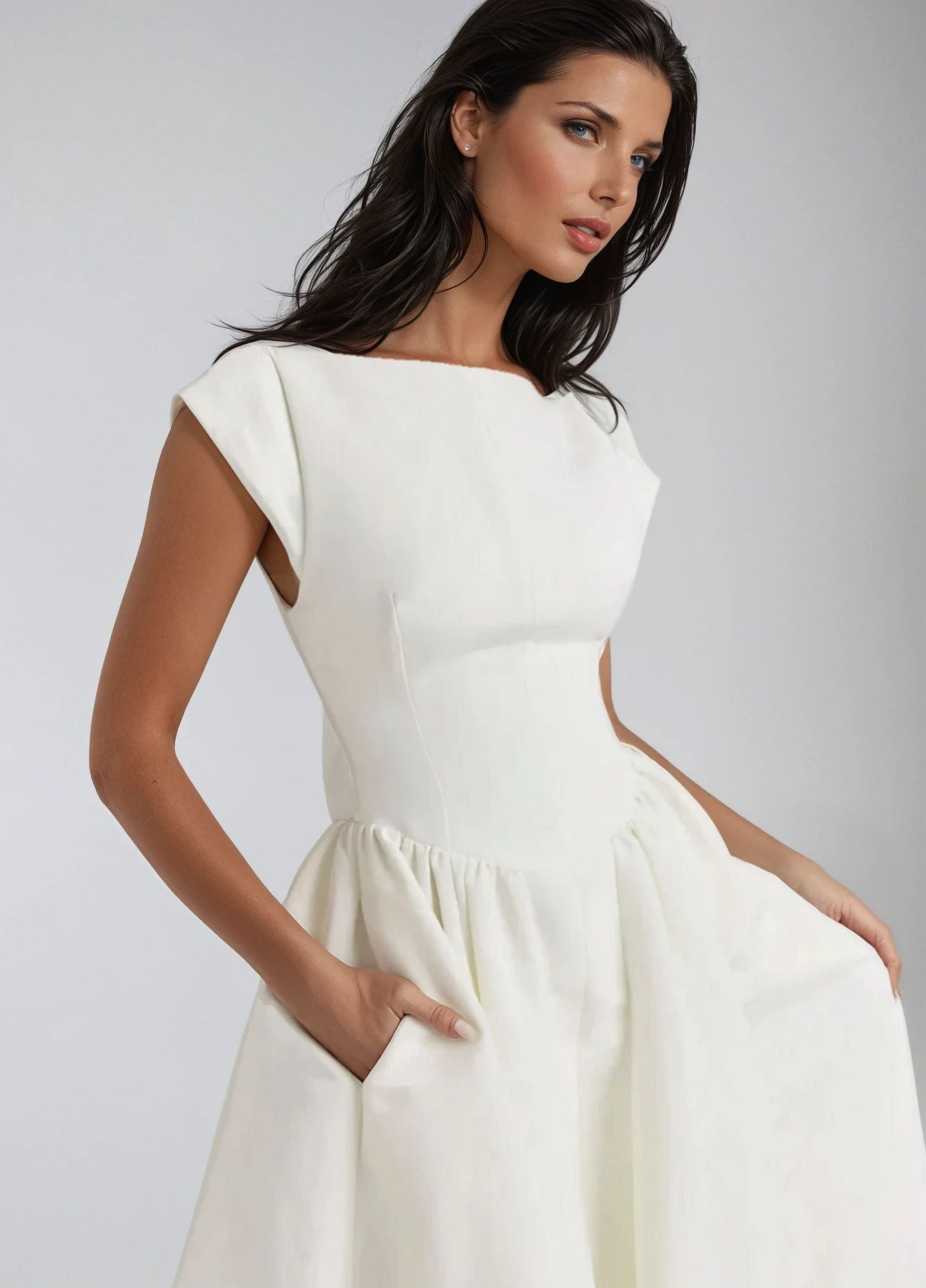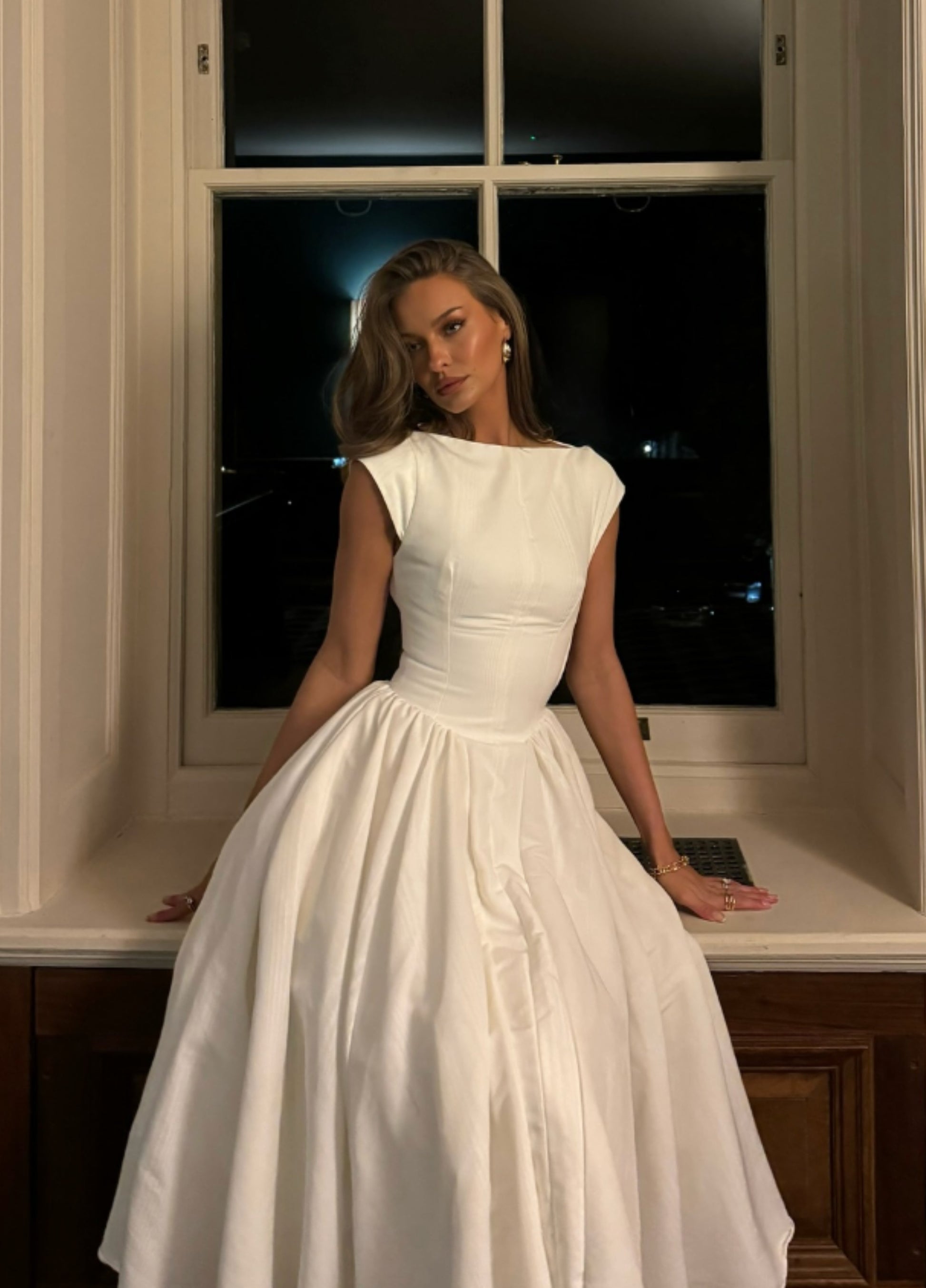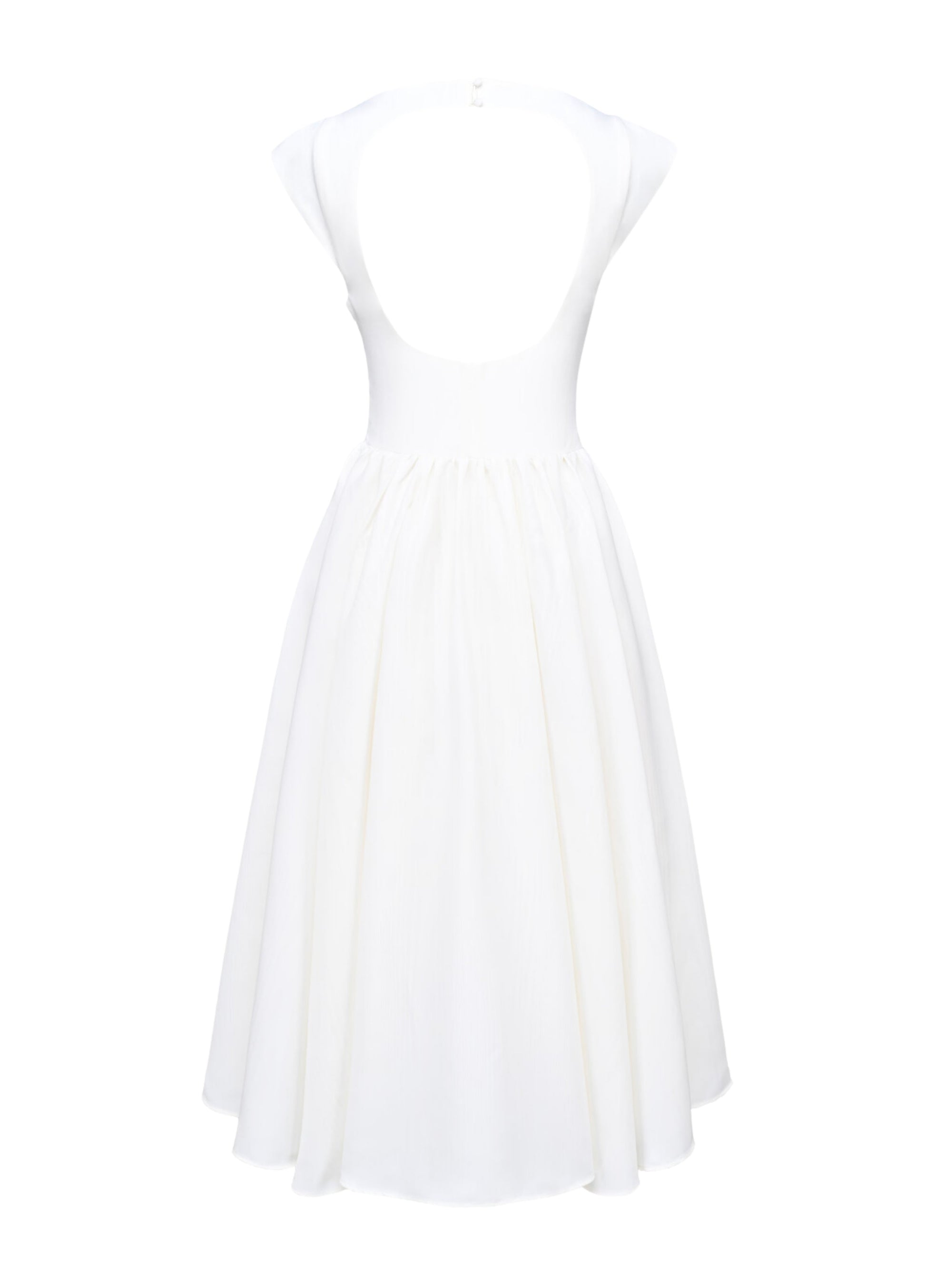 Odette embodies sophistication, crafted from a fluid, beautifully draped fabric that flows effortlessly. Designed for occasions that call for grace and confidence, it features a full-skirted silhouette, elegant dropped shoulder, and open-back design for a refined impression. The dress fastens with a concealed side zipper for a smooth, seamless finish.