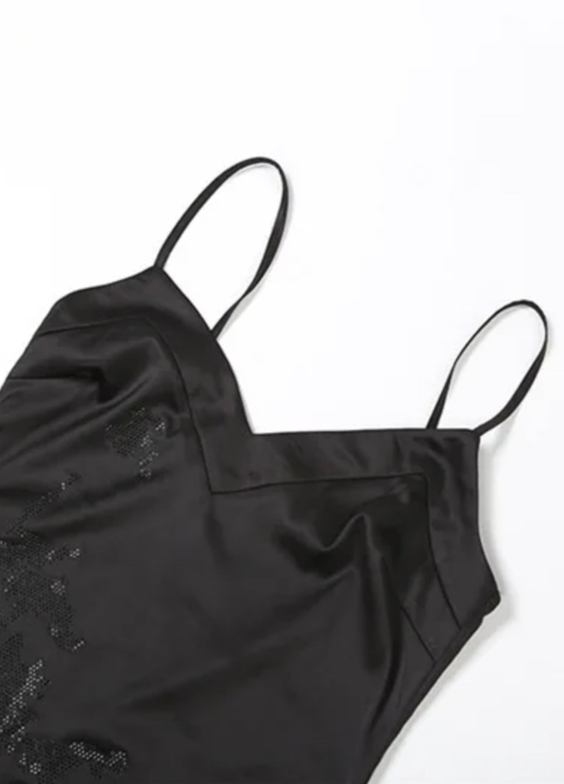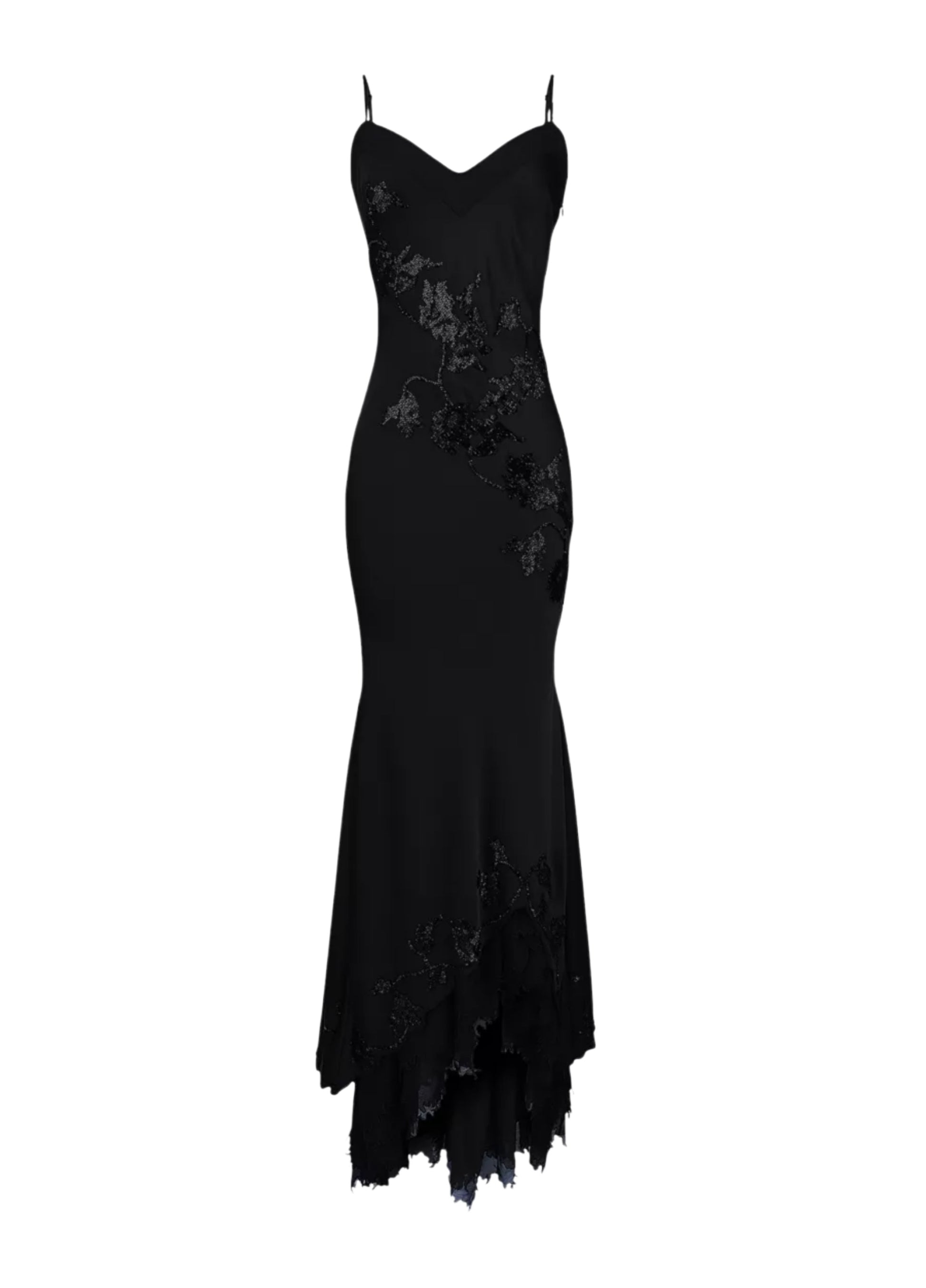Cracted from luxurious black satin that drapes effortlessly over the body, the Ravena features a sculpted silhouette traced with hand-placed embellishments. The chiffon-trimmed neckline and adjustable straps add a touch of softness, while the layered hem and asymmetric cut move with grace.
