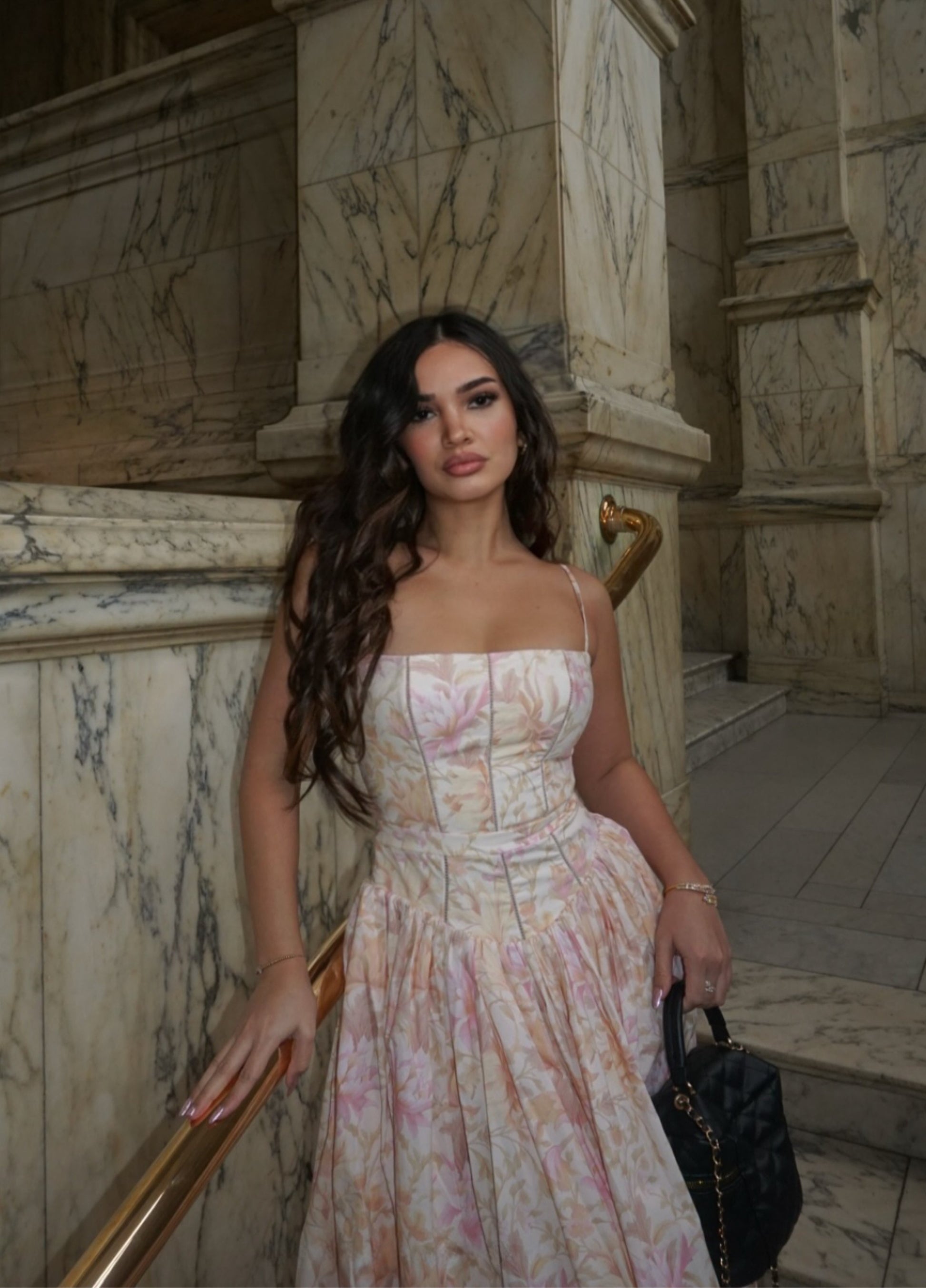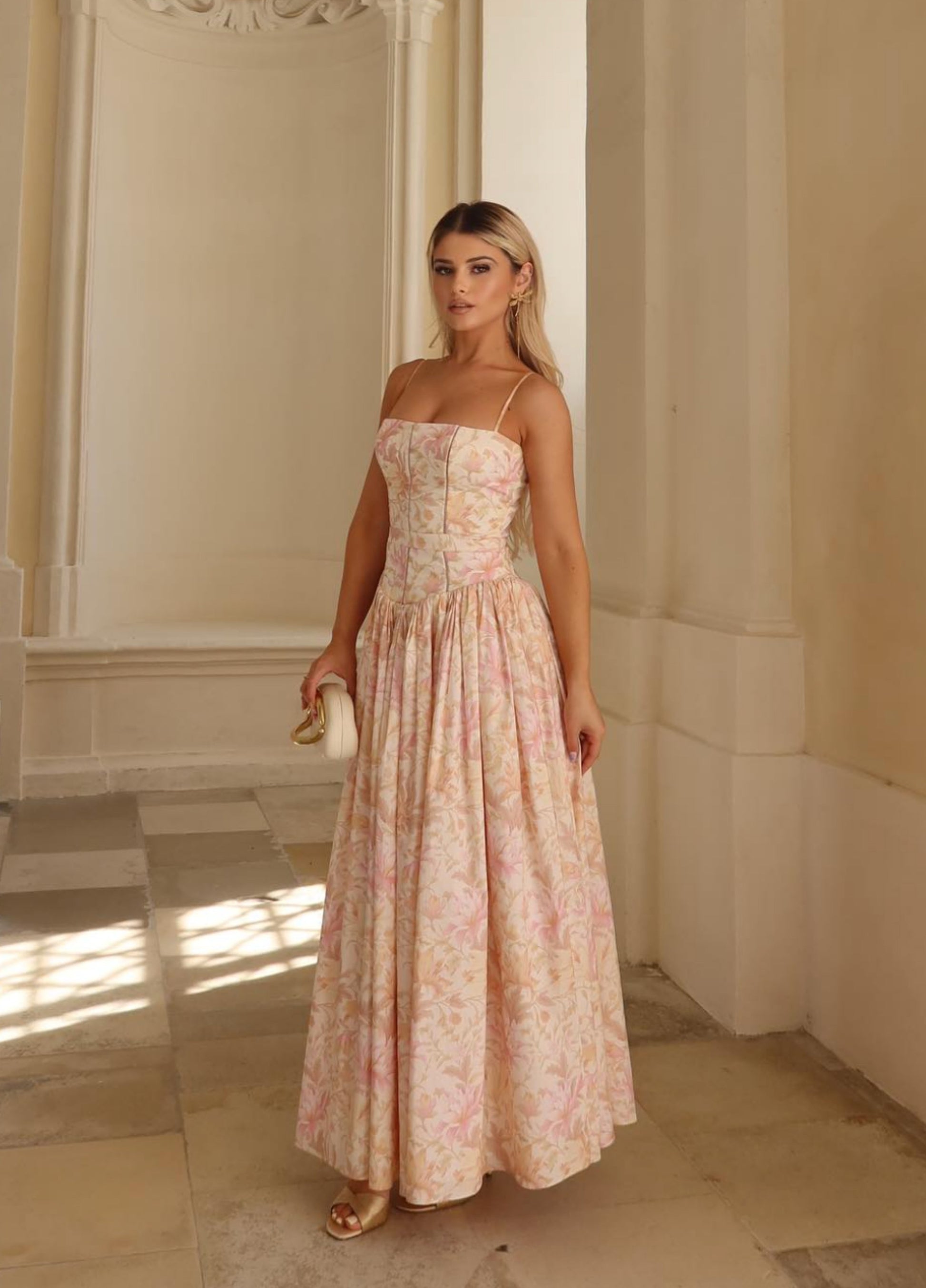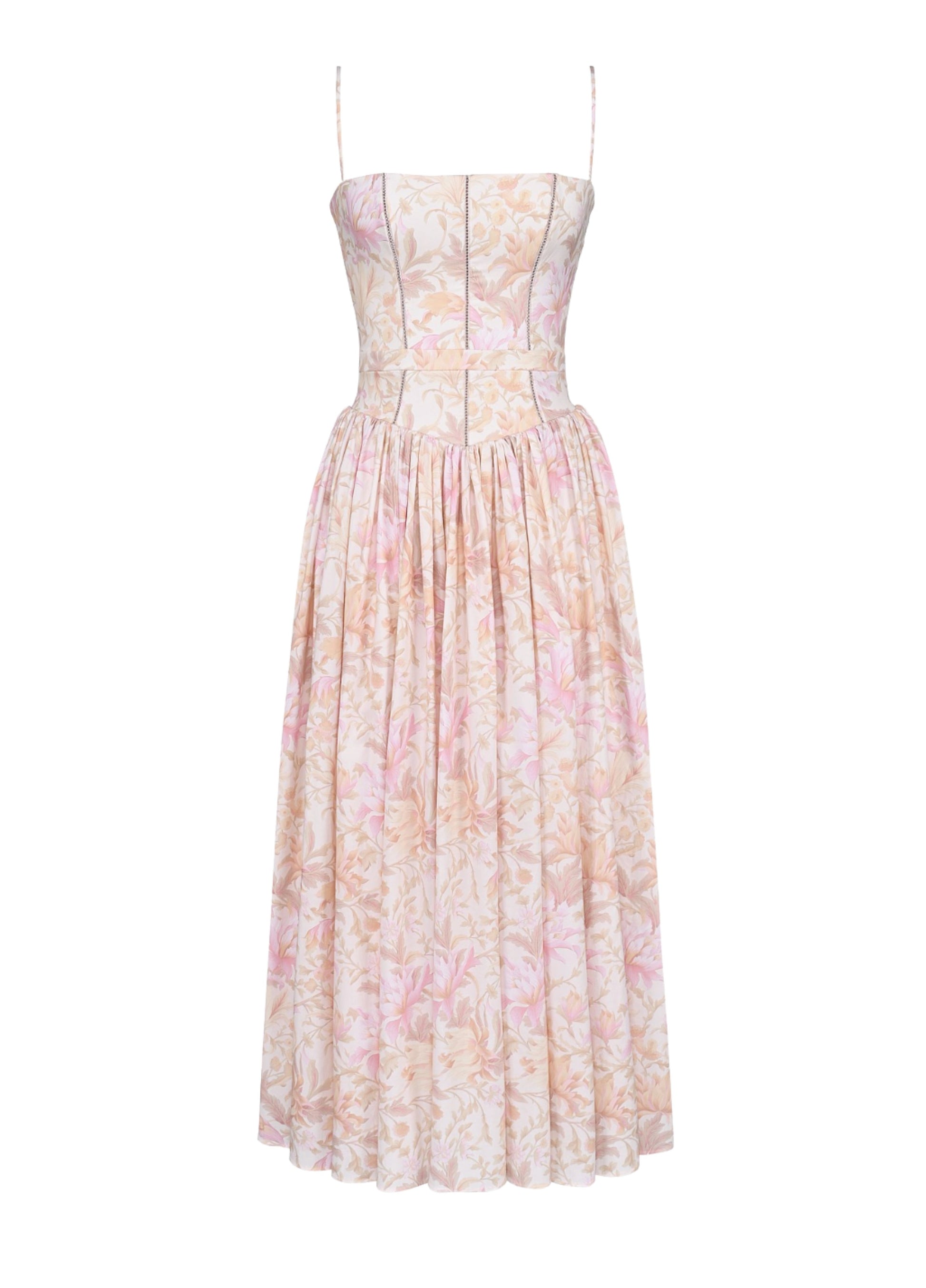 Seraphina is designed in a gentle peach floral print. The sculpted bodice, delicate ladder trims, and contoured panelling create a flattering shape with adjustable straps. Its full gathered skirt adds graceful movement, while a discreet back zipper ensures easy wear.