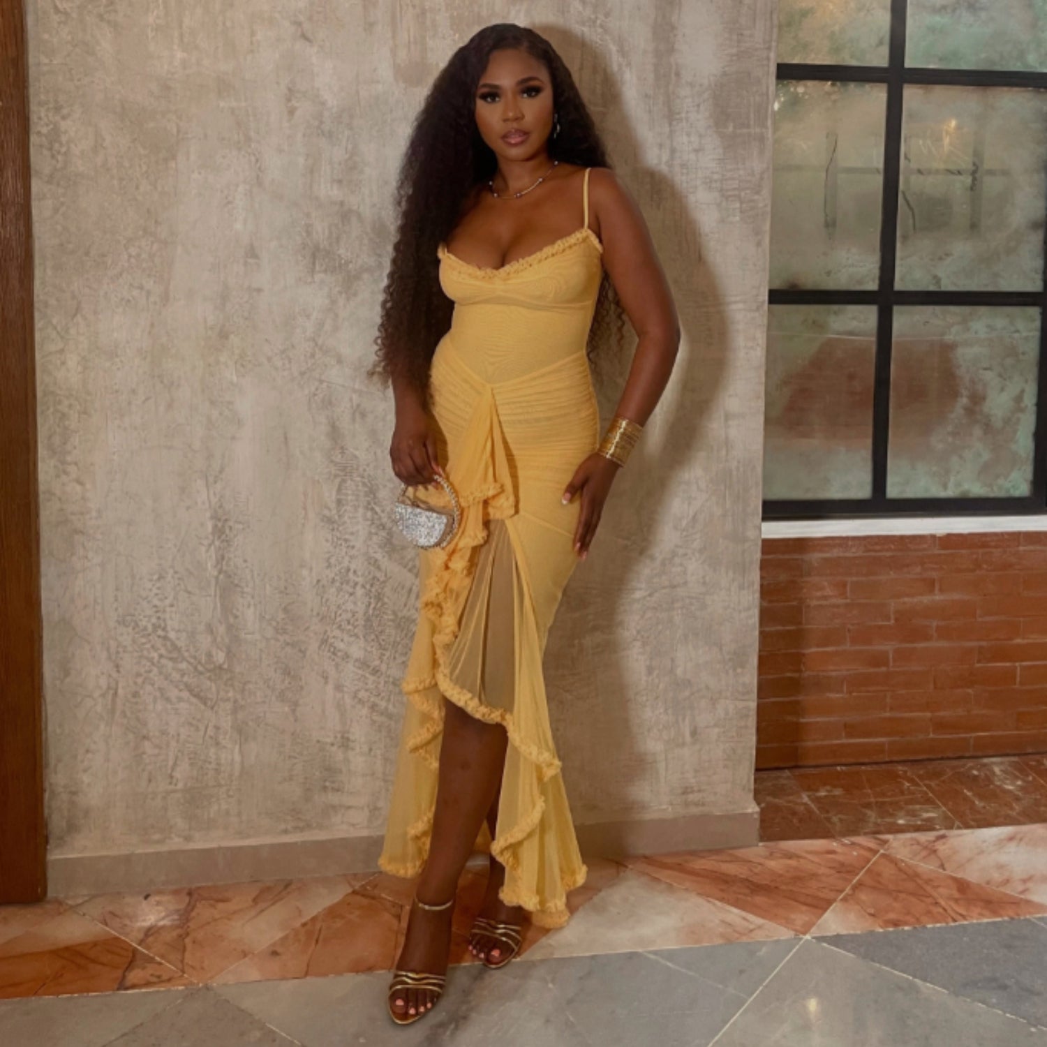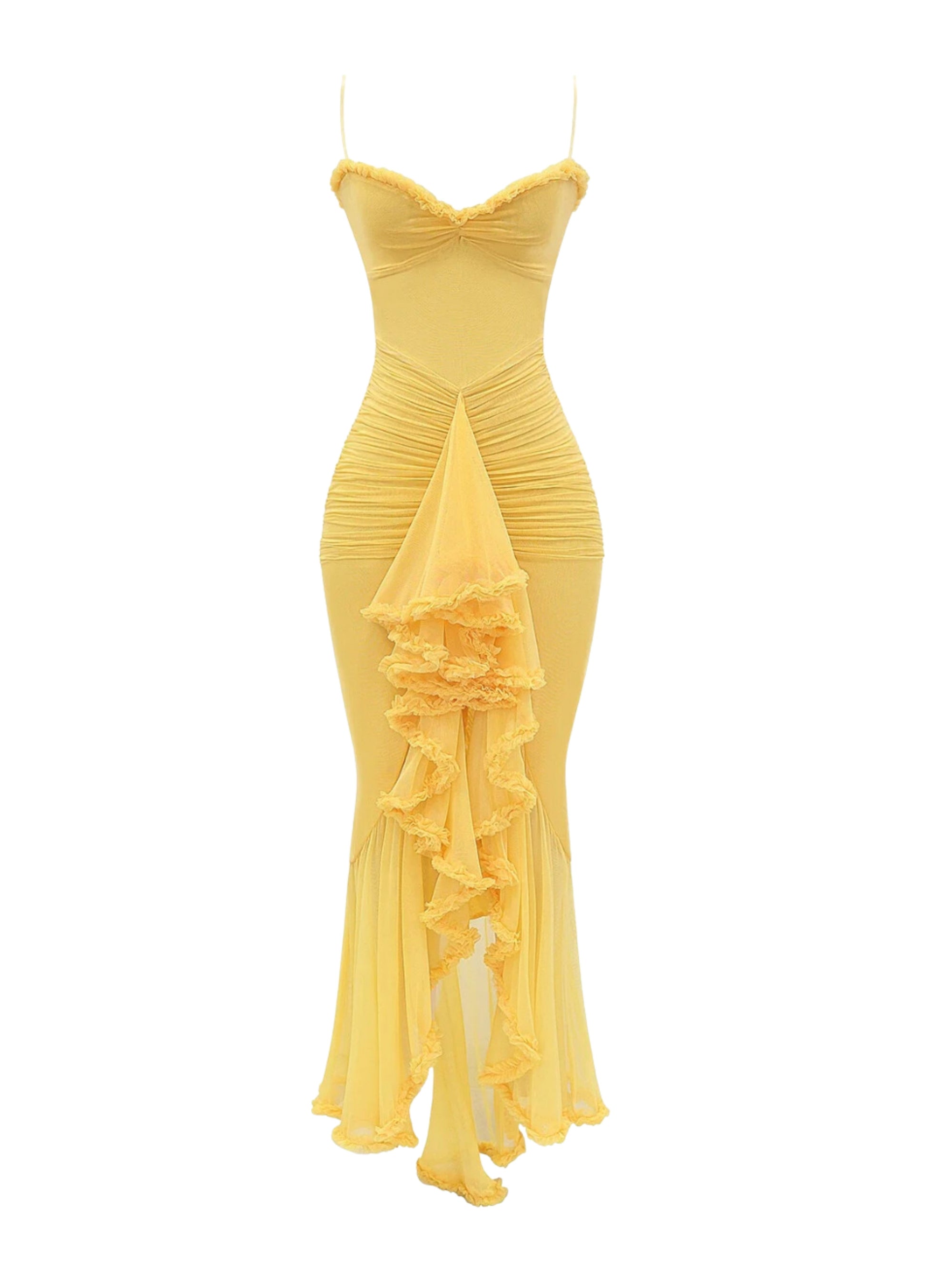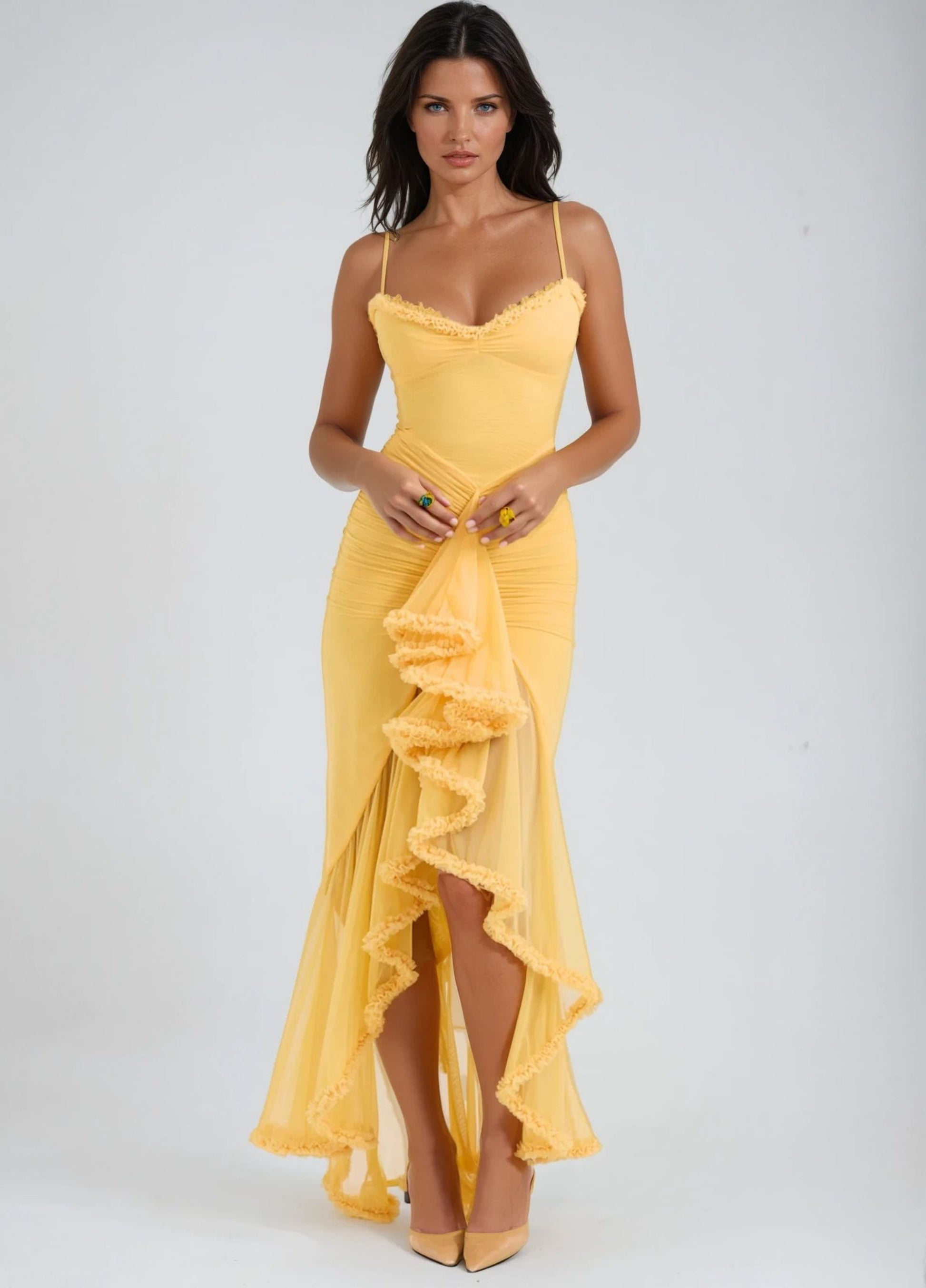 Our signature ruffle-front maxi—crafted to command attention with every step. Solene blends elegance with a striking silhouette, made for events that call for unforgettable style.