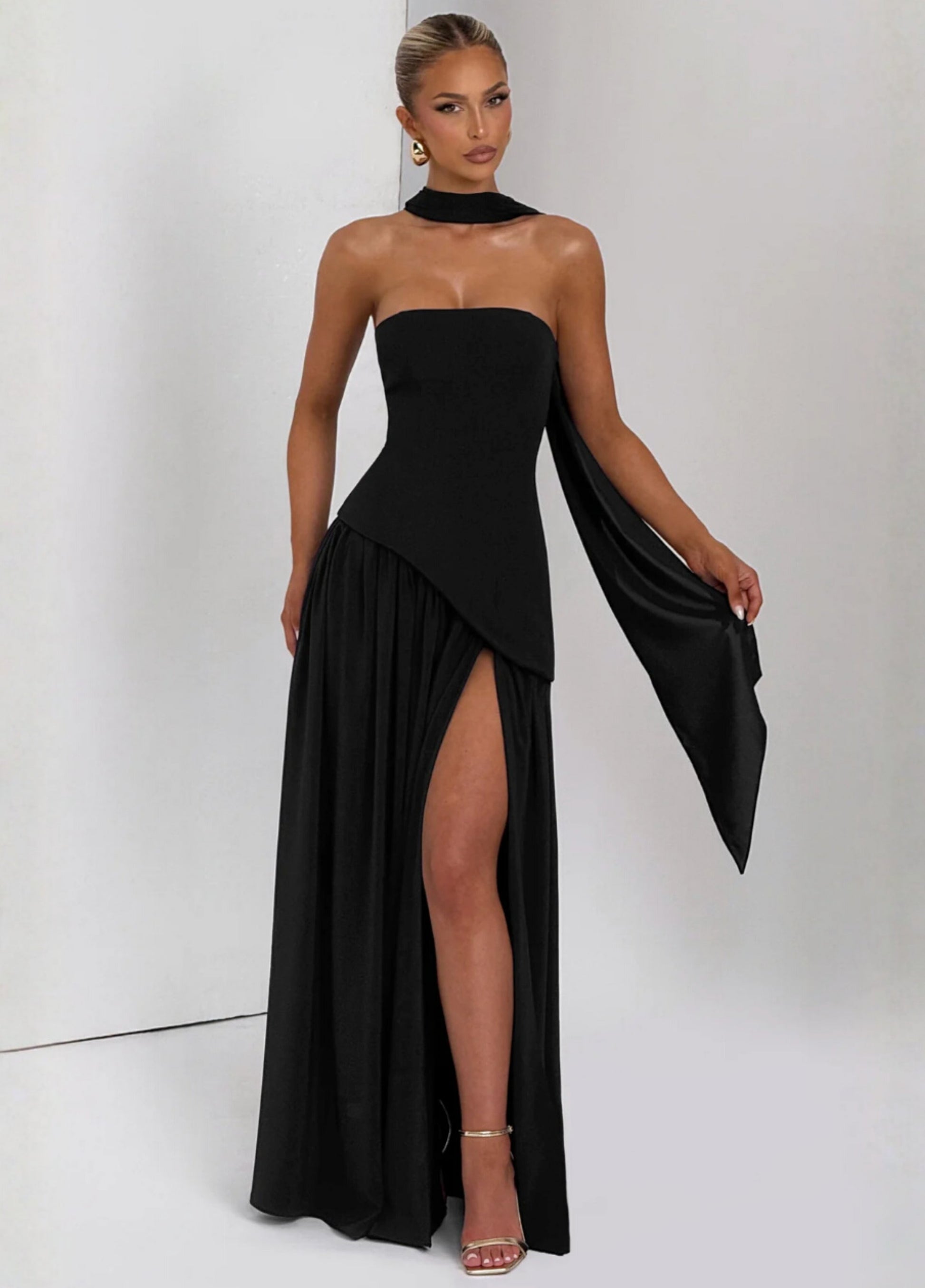 Sleek, sculpted, and unforgettable — Veyra blends structured elegance with fluid movement. A modern black statement for evenings that leave a lasting impression.